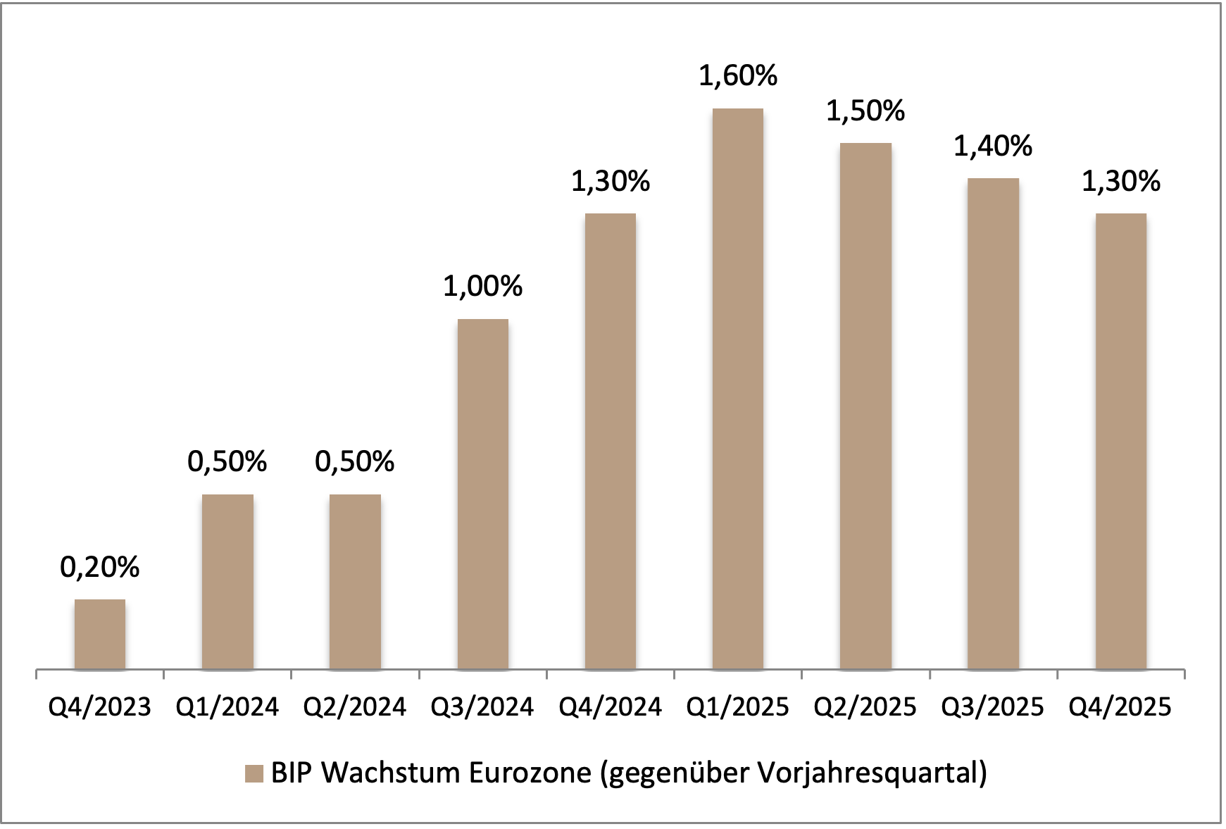 Europa hat seine BIP-Daten bereits veröffentlicht. Eurostat meldete für das Schlussquartal 2025 ein Wachstum in der Euro-Zone von 0.3 Prozent gegenüber dem Vorquartal, respektive 1.3 Prozent gegenüber dem Vorjahresquartal. Es ist kein Boom, aber es ist Kontinuität: Auch im Sommer hatte es ein Plus von 0.3 Prozent gegeben. Während die grossen Volkswirtschaften Deutschland (0.3 Prozent) und Frankreich (0.2 Prozent) solide abschnitten, präsentierten sich Spanien und Portugal mit jeweils 0.8 Prozent deutlich dynamischer. (Quelle: Reuters, Medienbericht, 13.02.2026)