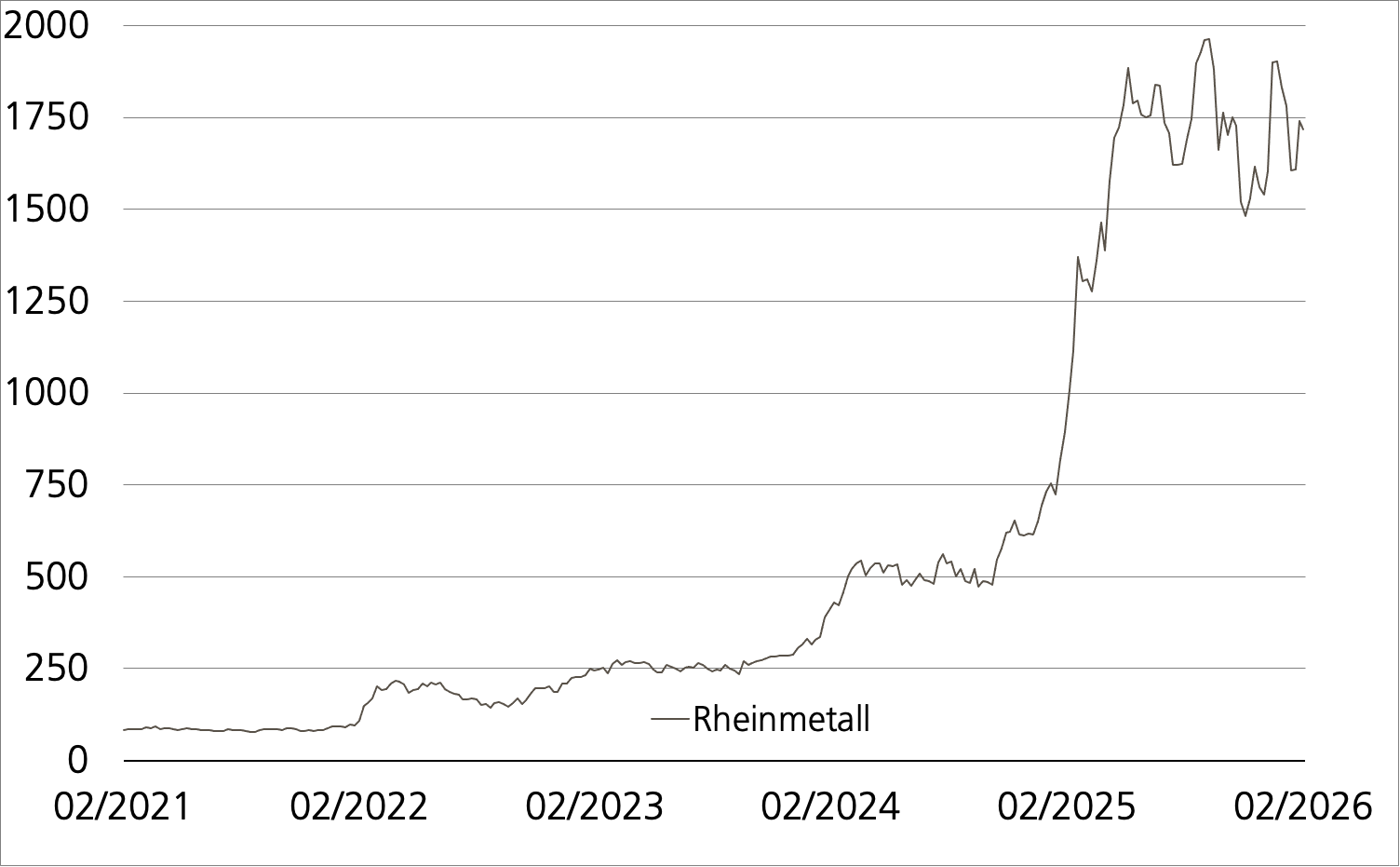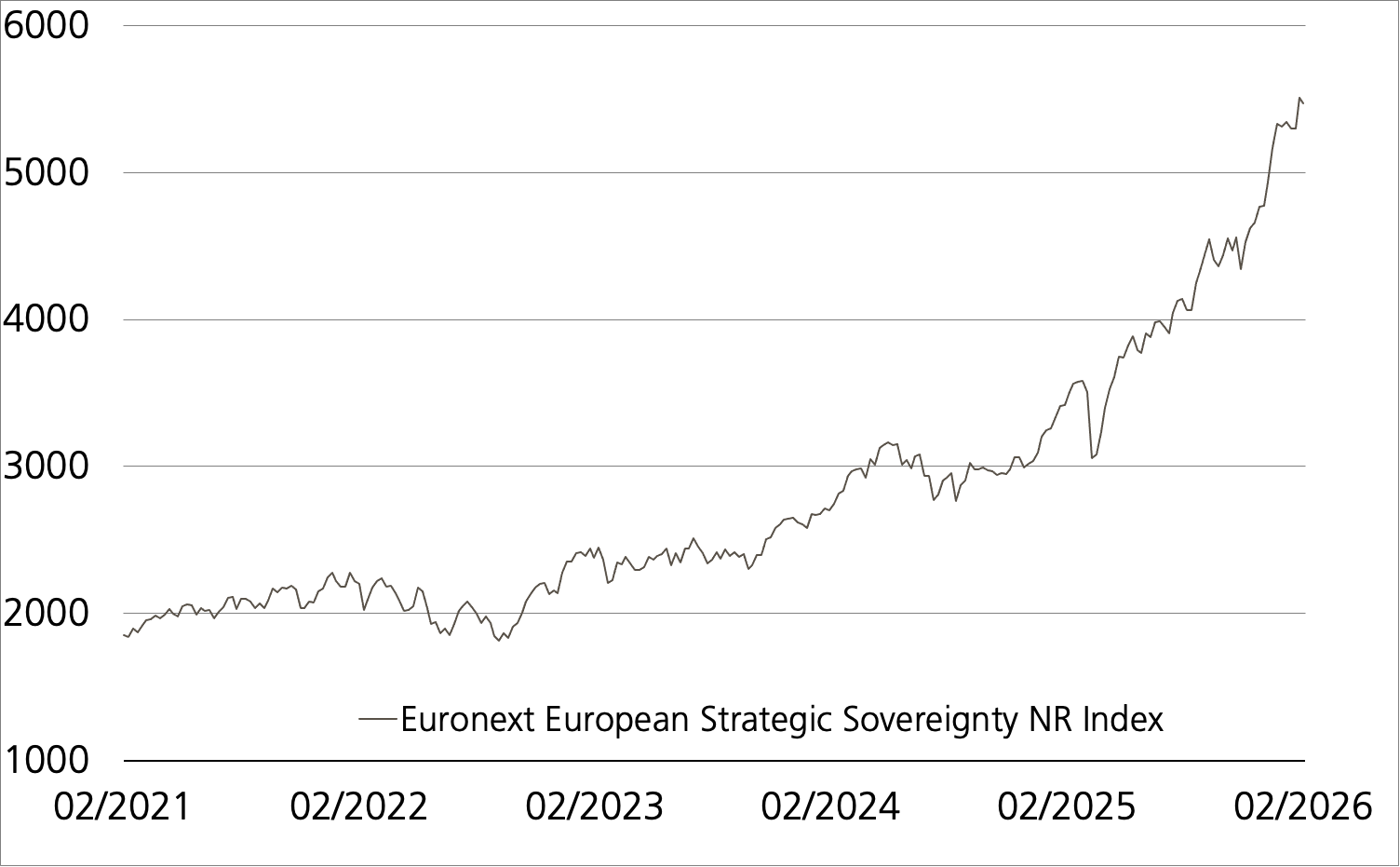 Mit einem kräftigen Fiskalimpuls versucht die Berliner Regierung, die deutsche Wirtschaft in Schwung zu bringen. Im Mittelpunkt steht ein 500 Milliarden Euro schweres Infrastruktur-Programm. Ausserdem fährt Deutschland die Ausgaben für Verteidigung nach oben. Im laufenden Jahr möchte die Regierung hierfür rund 108 Milliarden Euro bereitstellen. Zum Vergleich: 2024 lag der Verteidigungsetat bei knapp 52 Milliarden Euro. (Quelle: bundesregierung.de, «Das kann Deutschland», 03.11.2025) Passend zum expansiven Kurs der schwarz-roten Koalition hellt sich die Stimmung in der deutschen Wirtschaft allmählich auf: Im Februar 2026 ist das Ifo-Geschäftsklima zum ersten Mal seit dem vergangenen Oktober gestiegen. Mit 88.6 Punkten fiel das Stimmungsbarometer höher aus, als von Ökonomen erwartet. Laut dem Ifo Institut hat sich das Geschäftsklima in der Industrie, bei den Dienstleistern und am Bau verbessert. (Quelle: Reuters, Medienbericht, 23.02.2026)Positives Feedback hat zuletzt auch der Finanzdienstleister S&P Global bei der Befragung von rund 4’200 Unternehmen aus der Eurozone erhalten. Der daraus ermittelte Einkaufsmanagerindex ist im Februar 2026 überraschend deutlichum 0.6 auf 51.9 Punkte gestiegen. Damit hielt sich das Barometer über der Marke von 50, die als Schwelle zum Wirtschaftswachstum gilt. Der Einkaufsmanagerindex für die Industrie der Eurozone ist im Februar 2026 auf 50.8 Punkte, nach 49.5 Zählern im Monat zuvor, geklettert. Somit ist auch dieser wichtige Wirtschaftszweig auf Wachstumskurs eingeschwenkt. (Quelle: Reuters, Medienbericht, 20.02.2026)Die aktuellen Stimmungsbarometer untermauern die positiven Erwartungen an die Unternehmensgewinne. UBS CIO GWM geht davon aus, dass die Profite in Europa nach drei Jahren Stagnation 2026 um sieben Prozent steigen. Für 2027 haben die Analysten sogar ein Wachstum von 18 Prozent auf dem Zettel. Diese Prognose bezeichnet CIO GWM neben der gelockerten Fiskalpolitik in Deutschland und den verbesserten globalen Wachstumsaussichten als Argument für europäische Aktien. (Quelle: UBS CIO GWM, Monthly Investment Letter, 23.01.2026) 25 Top-Konzerne sind im Euronext European Strategic Sovereignty NR Index enhalten. Sie kommen aus Wirtschaftszweigen, die beim Streben Europas nach Sicherheit, wirtschaftlicher Stabilität und politischer Unabhängigkeit eine zentrale Rolle spielen. Dabei handelt es sich um die Sektoren Raumfahrt und Verteidigung, Technologische Hardware und Equipment, Banken, Alternative Energie, Edelmetalle sowie Bergbau.