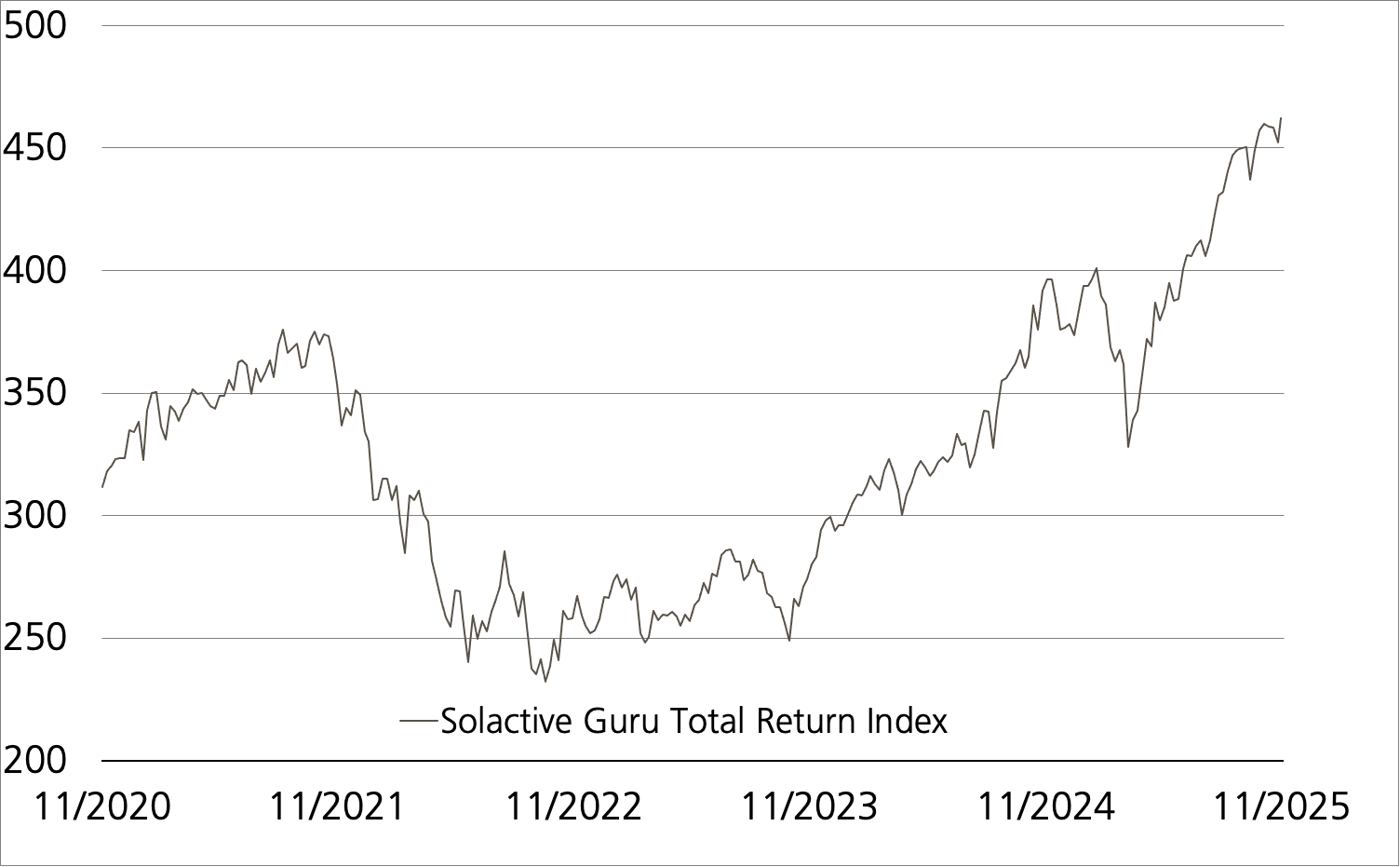 Am heutigen Donnerstag, 27. November, ist in den USA «Thanksgiving». Warren Buffett hat den Feiertag schon vor gut zwei Wochen für ein Schreiben an die Aktionäre von Berkshire Hathaway genutzt. Gleich zu Beginn des achtseitigen Briefes geht er auf seinen Abschied als CEO der Investmentholding ein und findet lobende Worte für seinen Nachfolger, Greg Abel. In einer unvergleichbaren Art blickt der 95-jährige anschliessend mit ausgewählten Anekdoten auf sein Leben zurück, gibt den Lesern gut gemeinte Ratschläge an die Hand und wünscht ihnen «a very happy Thanksgiving». (Quelle: Berkshire Hathaway, Medienmitteilung, 10.11.2025) Ein Woche nach diesem Schreiben zeigte sich, dass Berkshire am Ende der Buffett-Ära ein prominentes Investment getätigt hat. Im dritten Quartal 2025 ist die Beteiligungsfirma bei Alphabet eingestiegen. Per 30. September hielt Berkshire Hathaway ein knapp fünf Milliarden US-Dollar schweres Paket an Aktien des Google-Mutterkonzerns. Dagegen hat das Börsenimperium aus Omaha im US-Bundesstaat Nebraska zuletzt Apple-Aktien verkauft. Gleichwohl blieb der iPhone-Hersteller zum 30. September 2025 mit 64.9 Milliarden Dollar die grösste Aktienposition im Portfolio. (Quelle: Reuters, Medienbericht, 17.11.2025)Seit längerem sind Alphabet und Apple im Solactive Guru Index enthalten. Momentan zählen die beiden Technologiekonzerne zu insgesamt 79 Aktien, die es durch den Auswahlprozess für diesen Börsengradmessser schaffen. Sie liegen also in den Portfolios ausgewählter Hedgefonds, die zur Abgabe von 13F Filings verpflichtet sind. Der Schwerpunkt des Solactive Guru Index liegt auf Beteiligungsfirmen, die einen eher langfristigen sowie wertorientierten Anlagestil verfolgen. Um diese Prämisse zu erreichen, müssen die grundsätzlich in Frage kommenden Hedgefonds ein mehrstufiges Auswahlverfahren durchlaufen. Für die hernach verbleibenden Gesellschaften nimmt Solactive alle drei Monate die 13F Berichte unter die Lupe. Auf diese Basis erfolgt eine Überprüfung und gegebenenfalls Anpassung des Index.