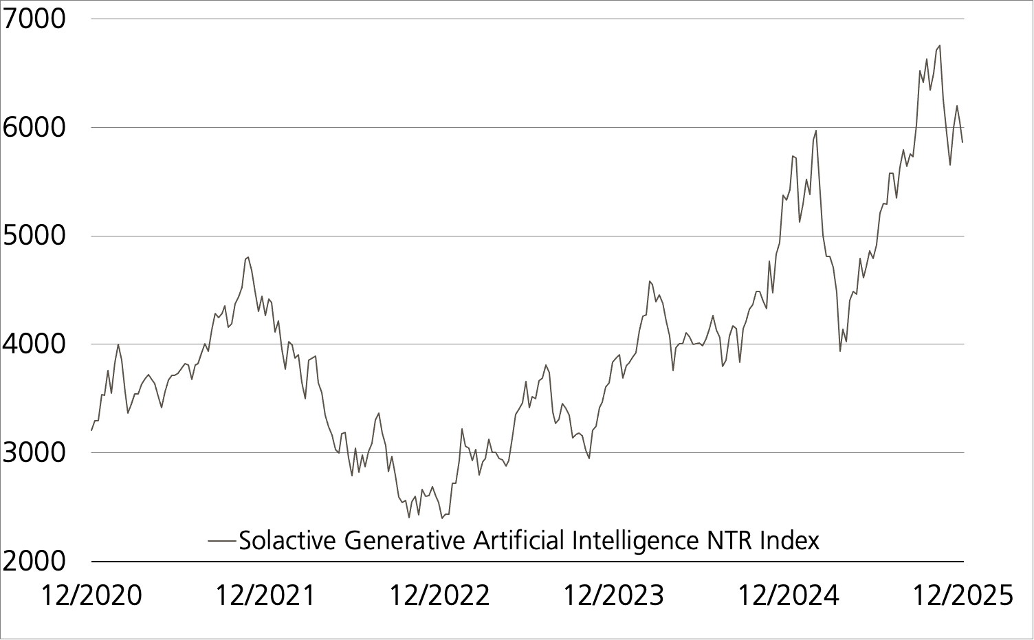 Auf der Zielgeraden des Börsenjahres 2025 ist die Euphorie um Technologieaktien im Allgemeinen und das Thema KI (im Fachjargon Artificial Intelligence, kurz AI) im Speziellen etwas abgeflacht. Die nachlassende Kaufbereitschaft bekam auch der Solactive Generative Artificial Intelligence Index zu spüren, siehe Grafik¹. Einerseits sind die Bewertungen in diesem Bereich nach oben gegangen. Gleichzeitig treiben steigende Schulden, politische Unsicherheitsfaktoren und eine anhaltende Inflation die Investoren um. Dazu passend hat UBS CIO GWM den Jahresausblick «Year Ahead 2026» mit folgender Frage betitelt: «Schwerkraft überwunden?». Die Experten setzen sich ausführlich damit auseinander, ob die Dynamik aus KI und Innovation den Märkten und Volkswirtschaften helfen kann, Fluchtgeschwindigkeit zu erreichen und damit den skizzierten Schwerkräften zu entkommen.In der 66 Seiten starken Publikation liefert CIO GWM eine klare Antwort. Zwar sollten Anleger die Risiken im Auge behalten, die mit solchen Booms verbunden sind. «Wir sind jedoch der Ansicht, dass die wirkungsstarken Trends der Investitionsausgaben und der beschleunigten Verbreitung im kommenden Jahr weitere Kursgewinne von Aktien mit KI-Bezug antreiben werden», bringen die Experten ihre Meinung auf den Punkt. 2026 könnten weltweit 571 Milliarden US-Dollar in dieses Technologiefeld fliessen. Damit würde die Investitionssumme gegenüber dem für das laufende Jahr erwarteten Niveau um knapp 35 Prozent steigen. Für die Zeit von 2025 bis 2030 prognostiziert CIO GWM ein Wachstum der Investitionen von im Schnitt 25 Prozent pro Jahr. Am Ende dieser Spanne könnten die Kapitalausgaben somit ein Volumen von rund zwei Billionen US-Dollar erreichen.Folgerichtig bleibt CIO GWM bei der Überzeugung, dass derart transformative Innovationen zu den wichtigen Treibern der Aktienmarktrenditen zählen. Neben der KI ordnen die Analysten die Themen Energie und Ressourcen sowie Langlebigkeit diesem Spektrum zu. Das Anlagefeld KI unterteilt sie in die Ebenen «Wegbereiter», «Intelligenz» und «Anwendungen». Im ersten Segment sind KI-Grundlagen wie Rechenzentren, Halbleiter oder Cloud-Computing angesiedelt. Die Intelligenzebene umfasst Software, Algorithmen und Datenplattformen. Sie ermöglichen es KI-Systemen, zu lernen, logische Schlüsse zu ziehen und Erkenntnisse zu generieren. Dem Segment Anwendung ordnet CIO GWM Produkte und Dienstleistungen für Endnutzer zu. Alle drei Ebenen zusammen könnten 2030 einen Gesamtumsatz von 3.1 Billionen US-Dollar erreichen – damit trauen die Experten dem KI-Markt ein durchschnittliches jährliches Wachstum von 30 Prozent über sechs Jahre zu. (Quelle: UBS CIO GWM, «Year Ahead 2026», 20.11.2025)